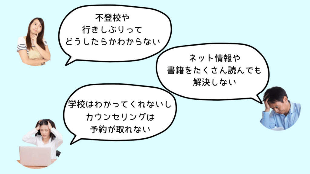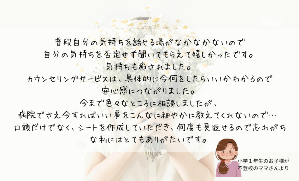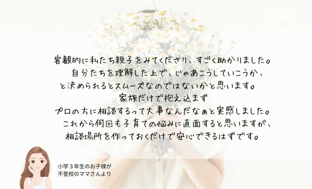 不安や疑問を「見える化」し、お子さんが何に悩み、どうすれば心を開くのか、そして親としてどう向き合っていけばよいのかを一緒に考え、一歩先へ進むお手伝いをします。